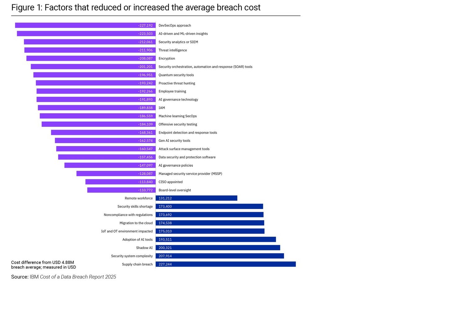 The IBM Cost of a Data Breach Report 2025 provides an analysis of the key factors that increased or reduced the average breach cost. The accompanying chart captures the impact of both the most significant cost amplifiers and the most effective cost mitigators on the overall average data breach cost.
